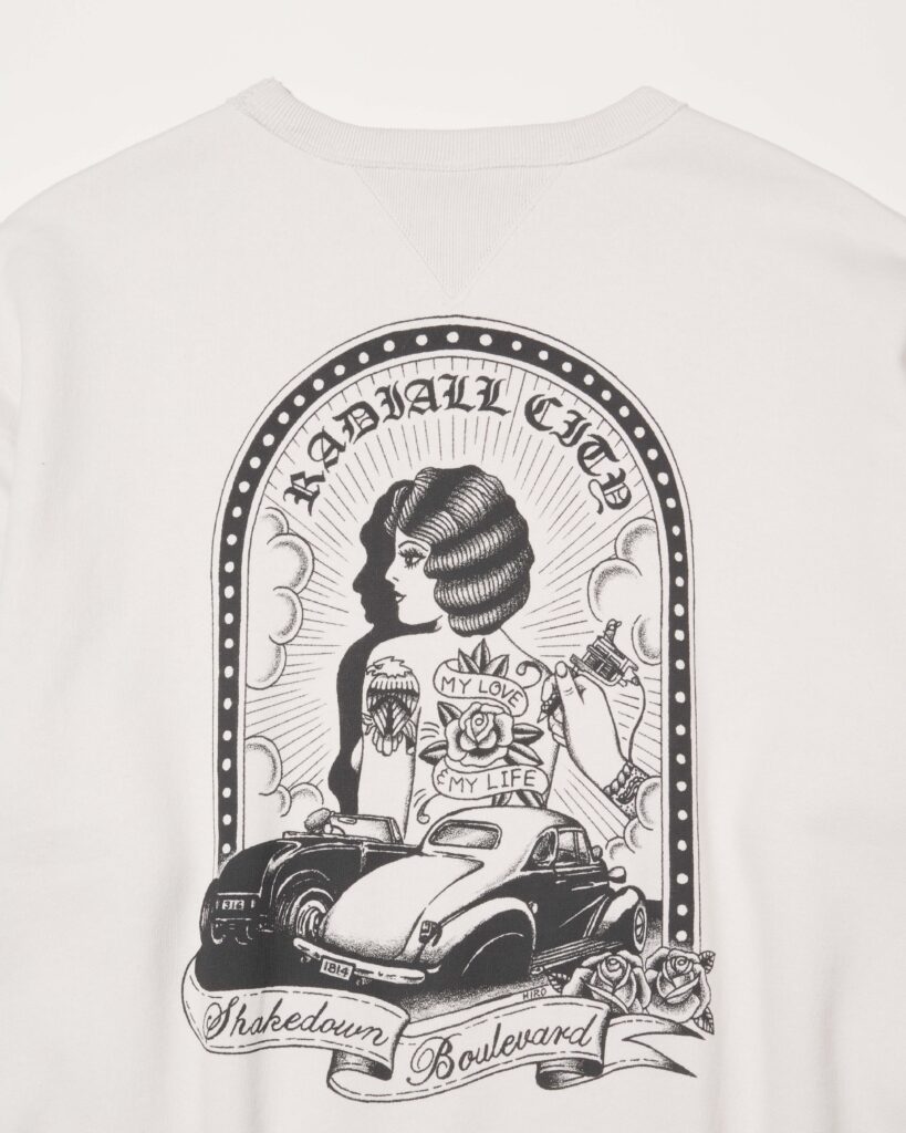 左胸にロゴプリント、背中はCOTTON PICKIN TATTOOのHIRO氏のアーカイブアートワークがスクリーンプリントで入る。