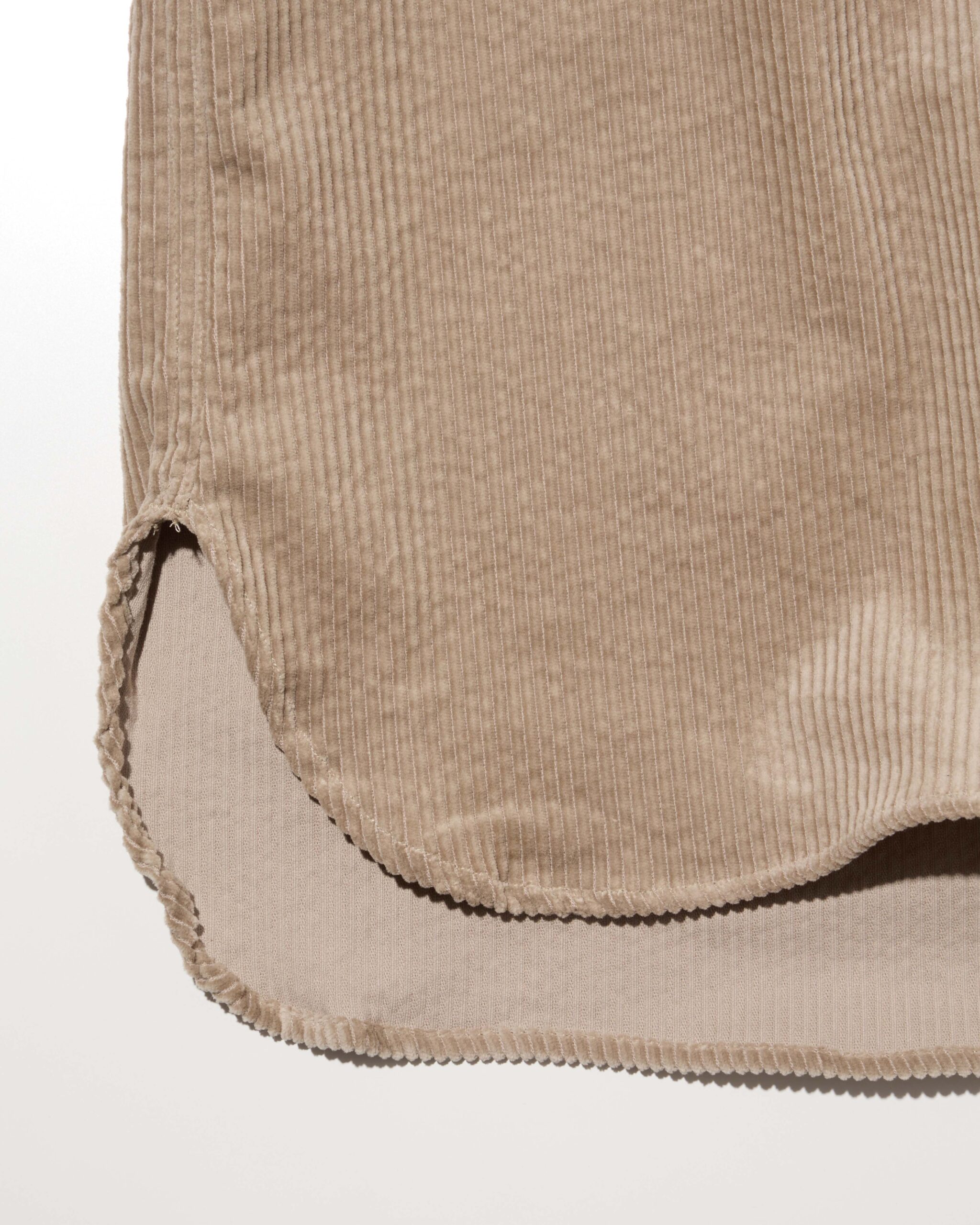 羽織れるようにしたサイジングに、裾はラウンドカット。