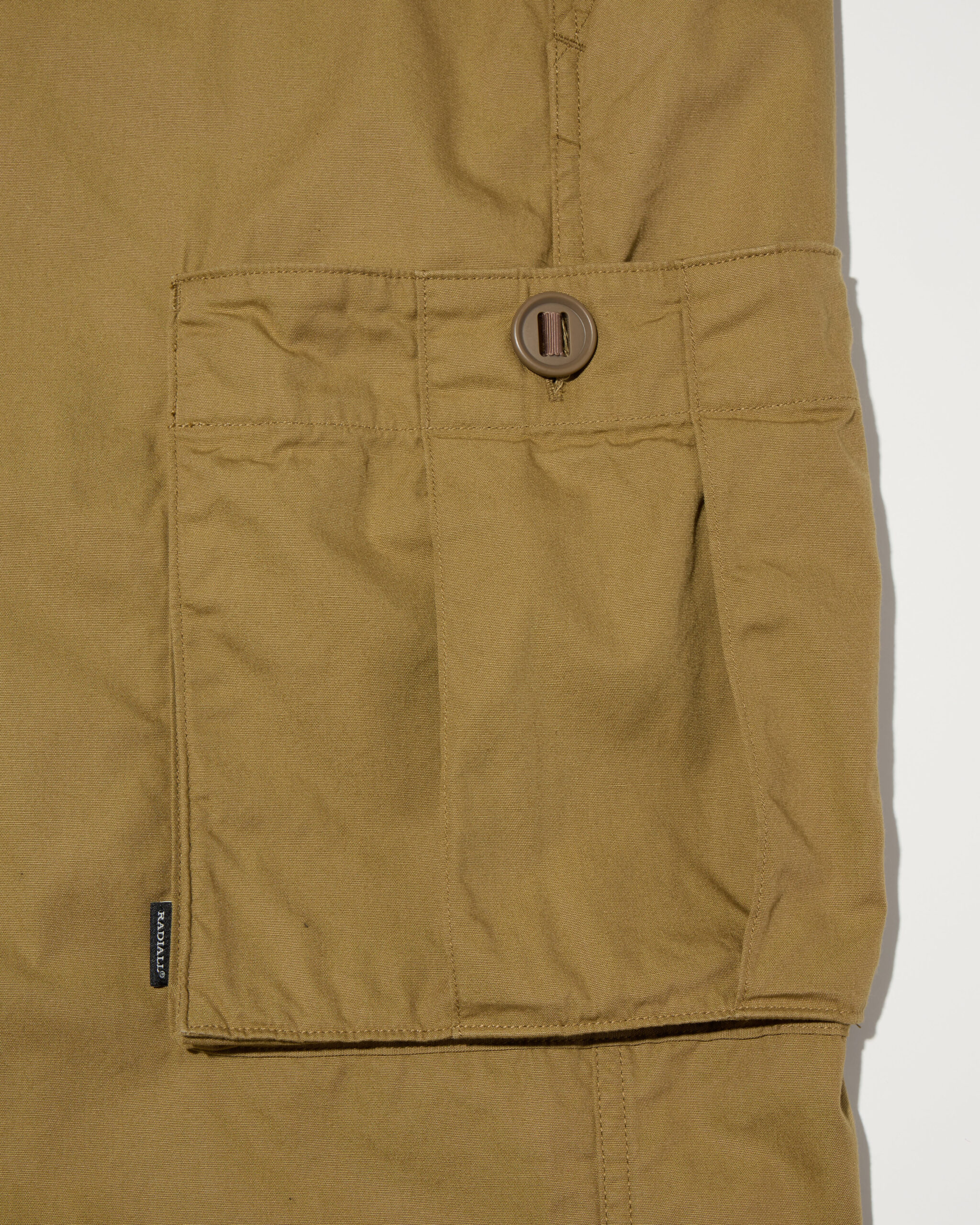 カーゴポケットは容易なアクセスに配慮し、フラップを無くしたパラシュートボタンを採用。