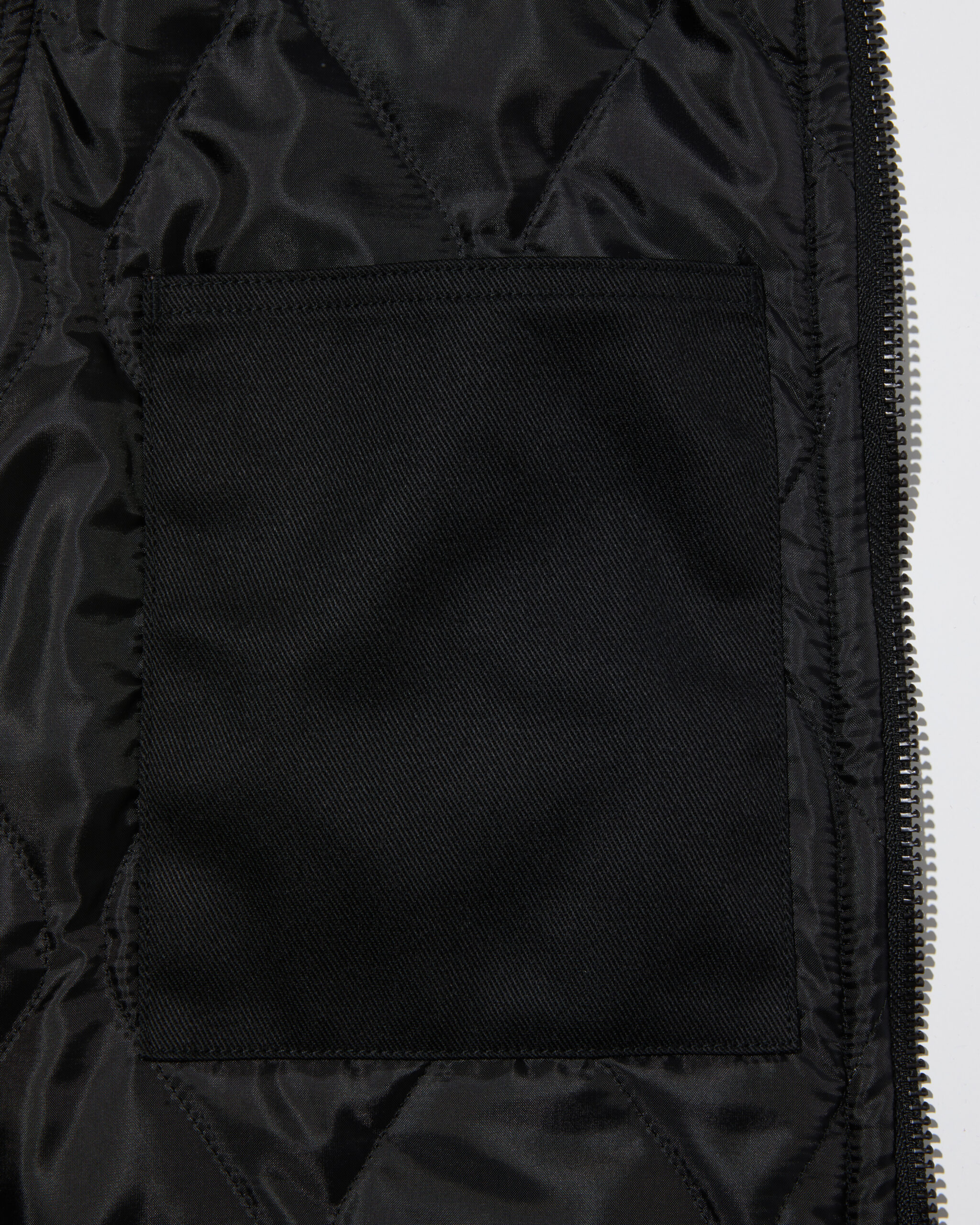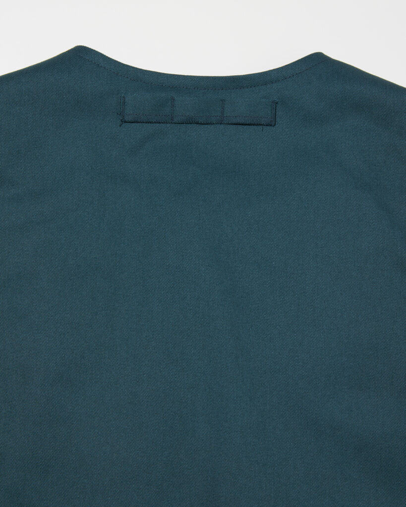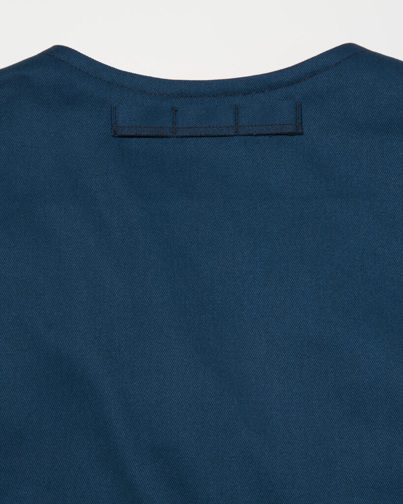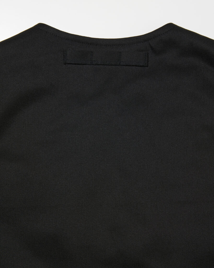 ブランドオリジナルのマットブラックのファスナーヘッドを採用し、背面にはハンガーがない時でもフックにかけられるよう襟吊りが付き。
