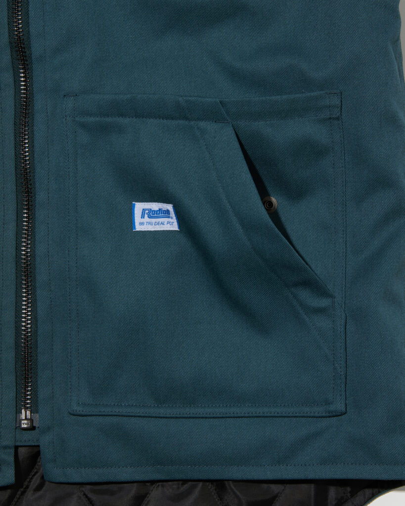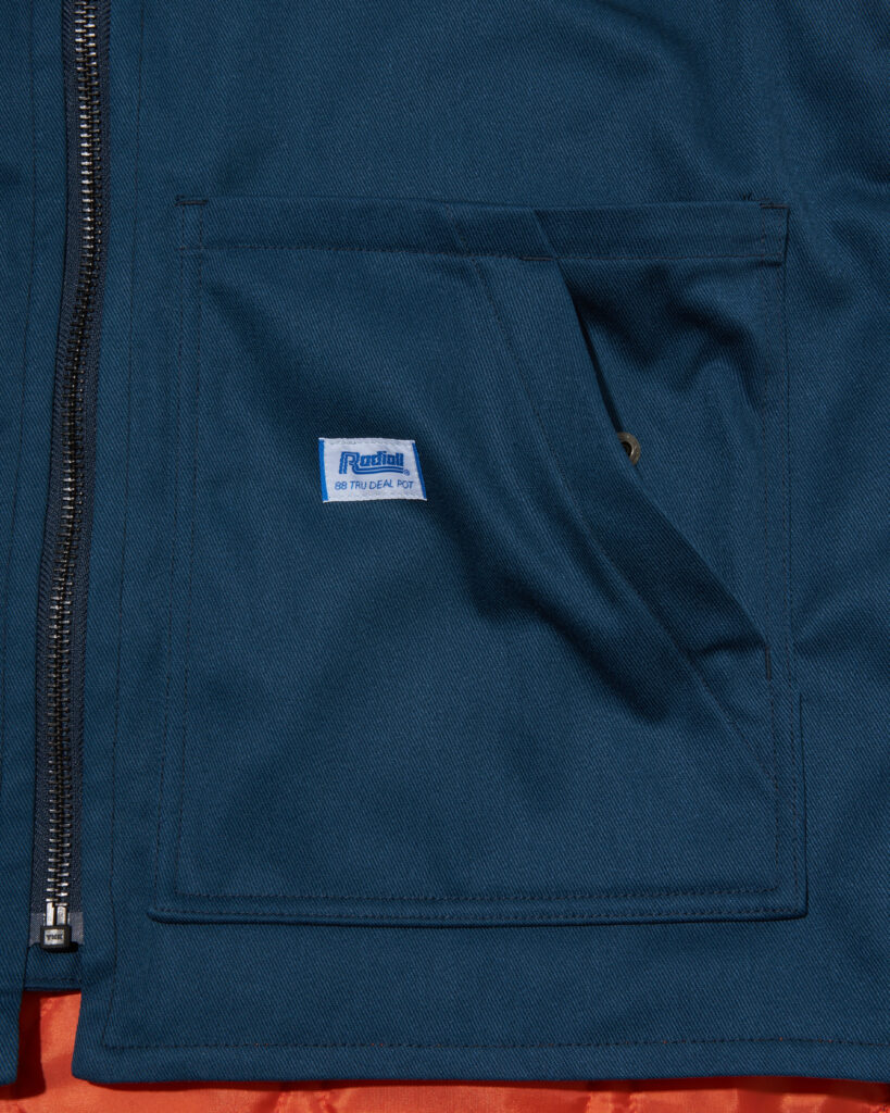 表生地にはオリジナルのT/Cツイル、裏生地には軽くて丈夫なポリエステルタフタを使用し、中綿には機能素材のシンサレートを60g使用。
