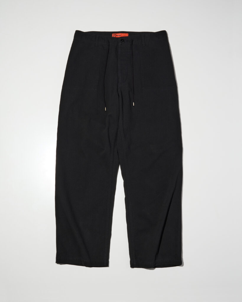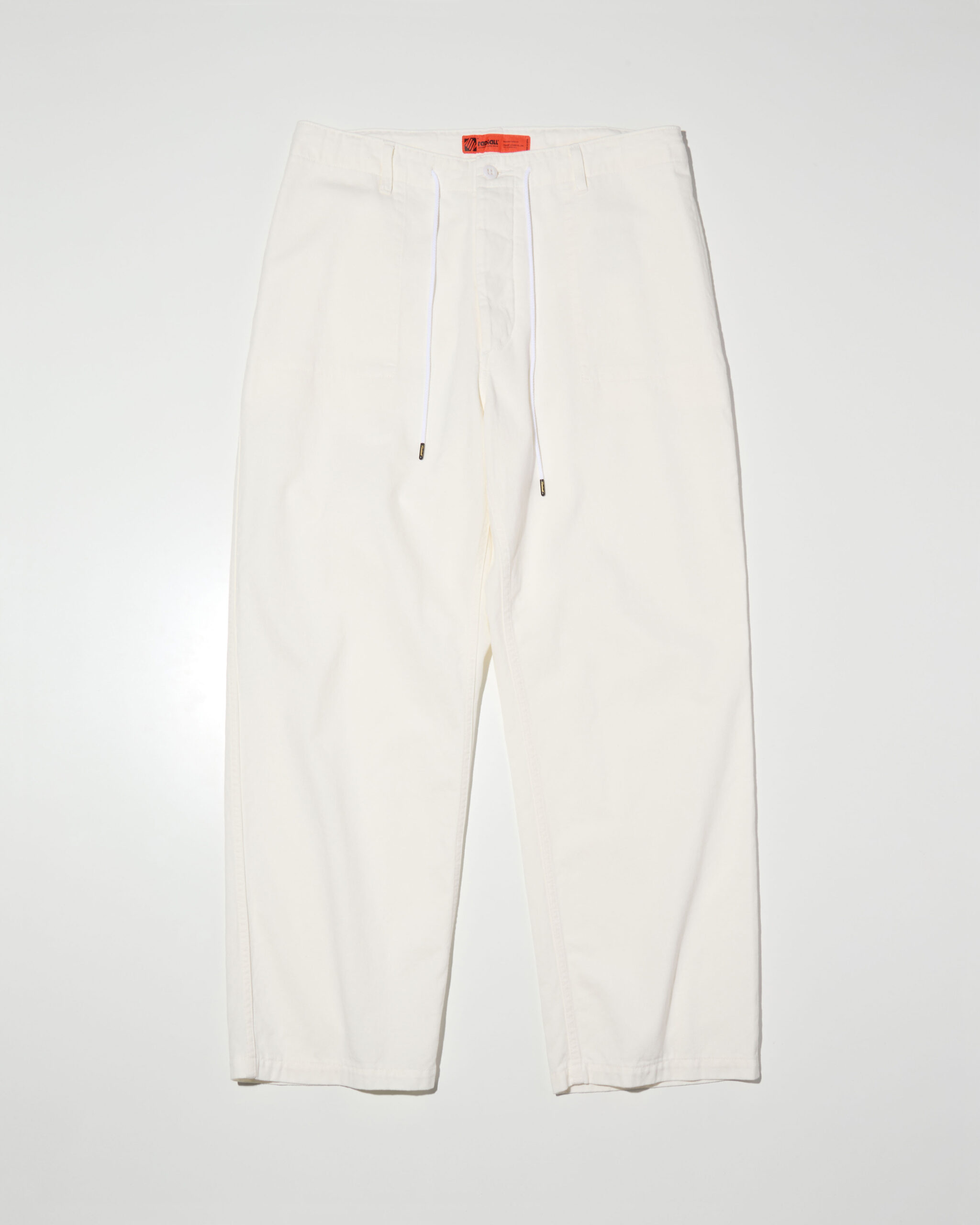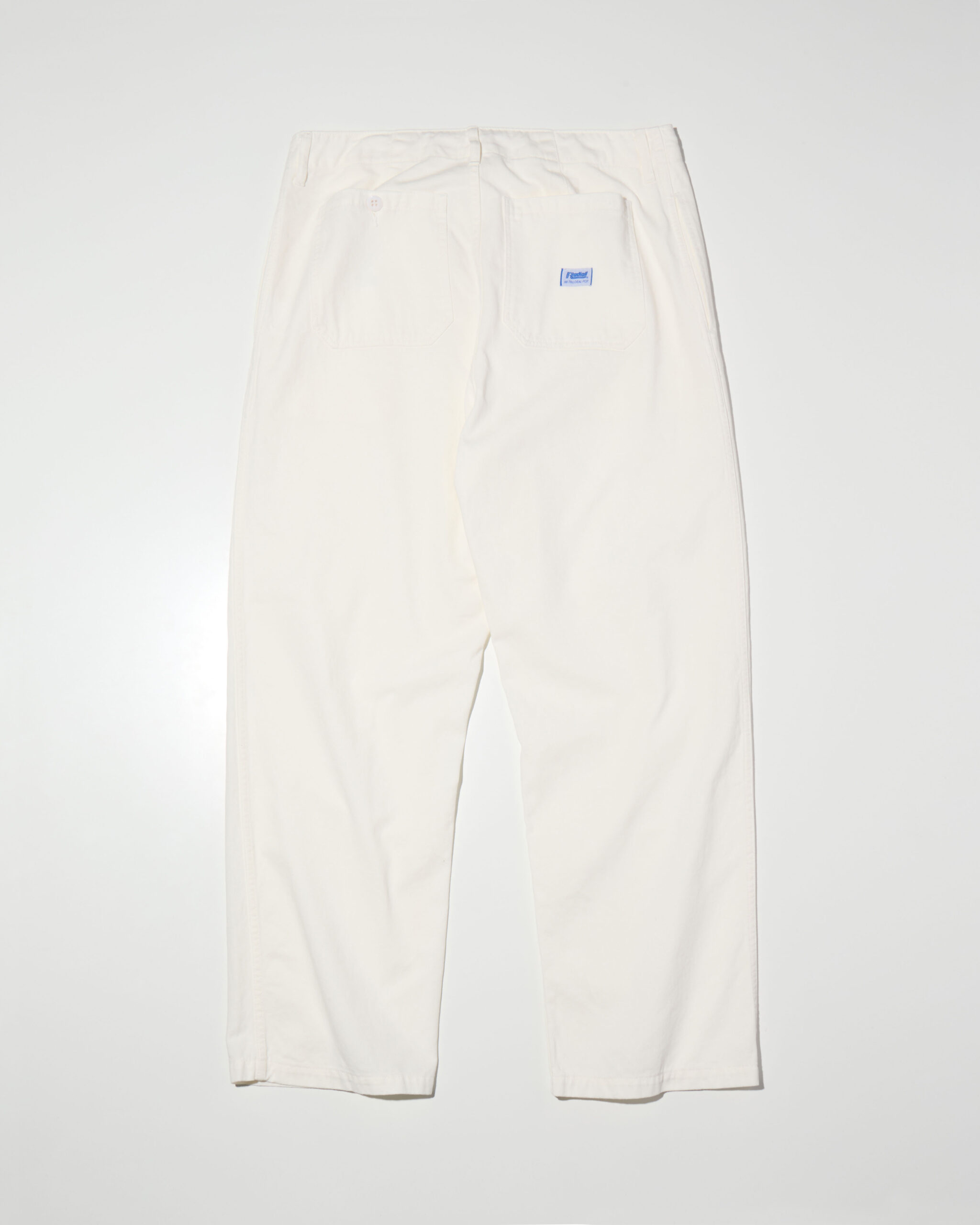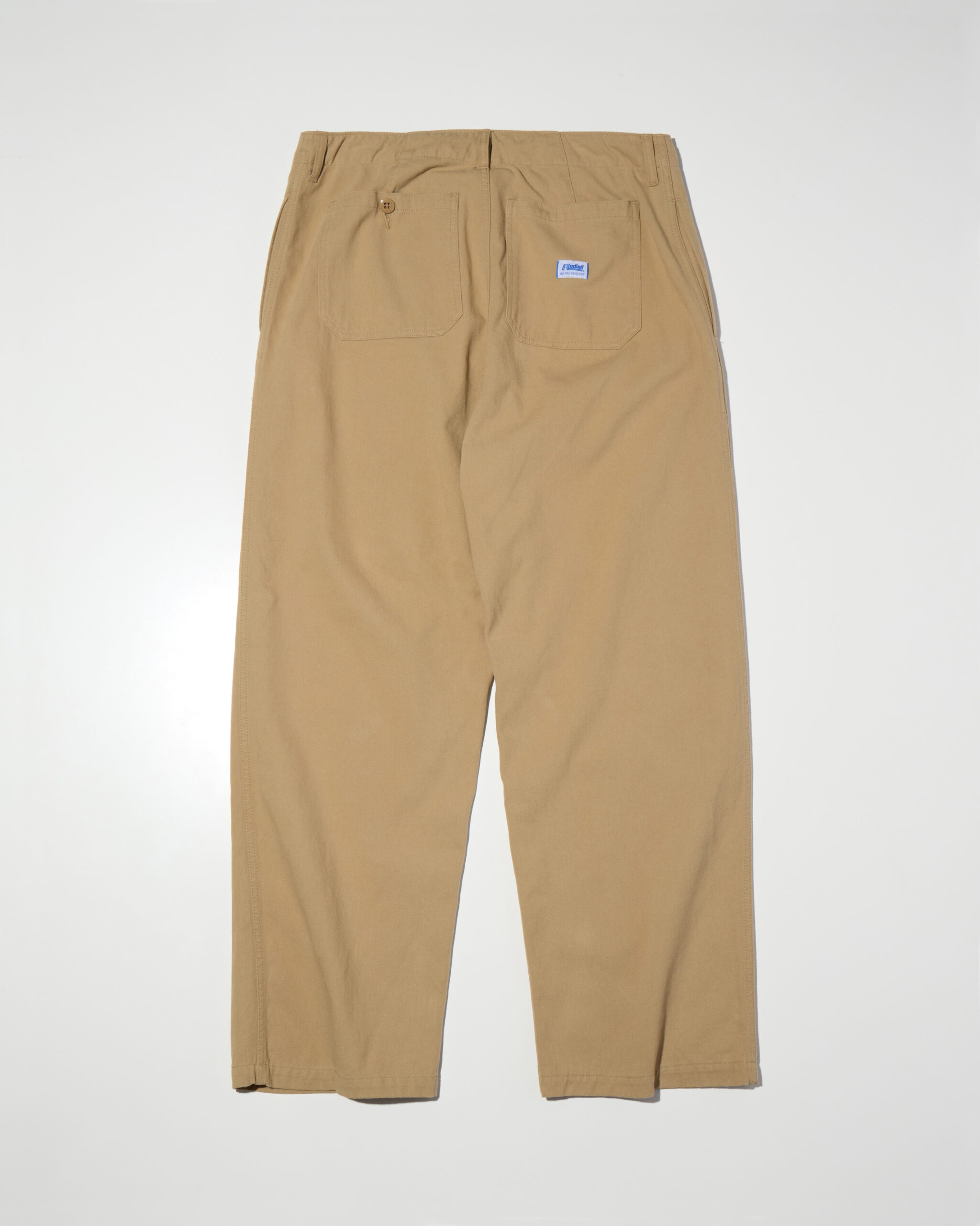 通常よりも強く撚った糸を使用することでドライタッチでシャリ感が強くまた、オチ感と耐久性を兼ねた強撚チノを使用したワークイージーボタンフライパンツ。