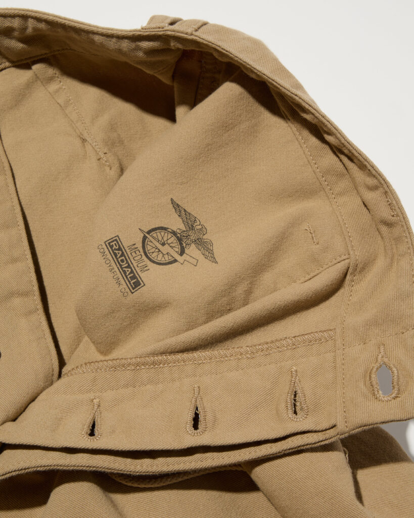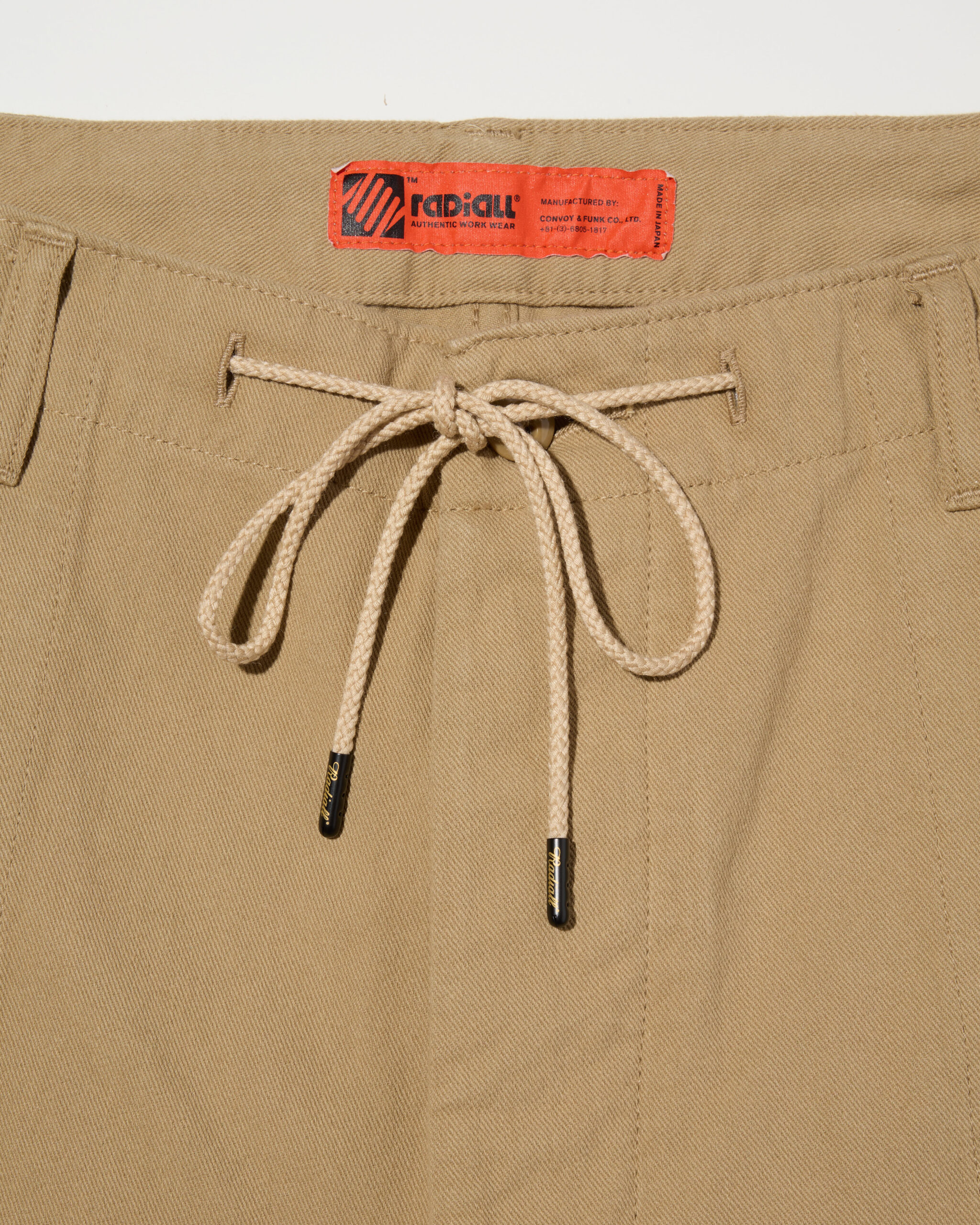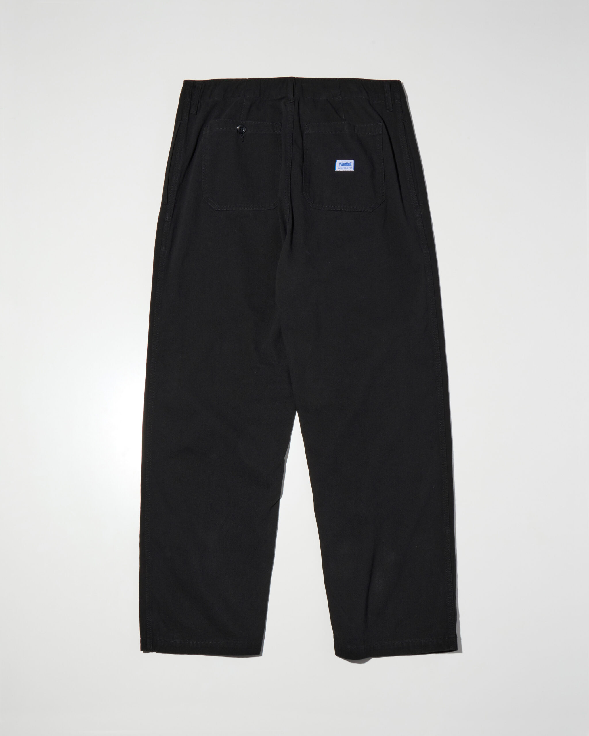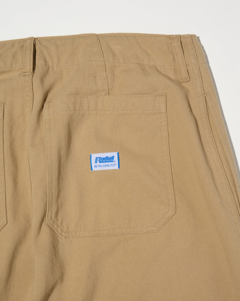 通常よりも強く撚った糸を使用することでドライタッチでシャリ感が強くまた、オチ感と耐久性を兼ねた強撚チノを使用したワークイージーボタンフライパンツ。