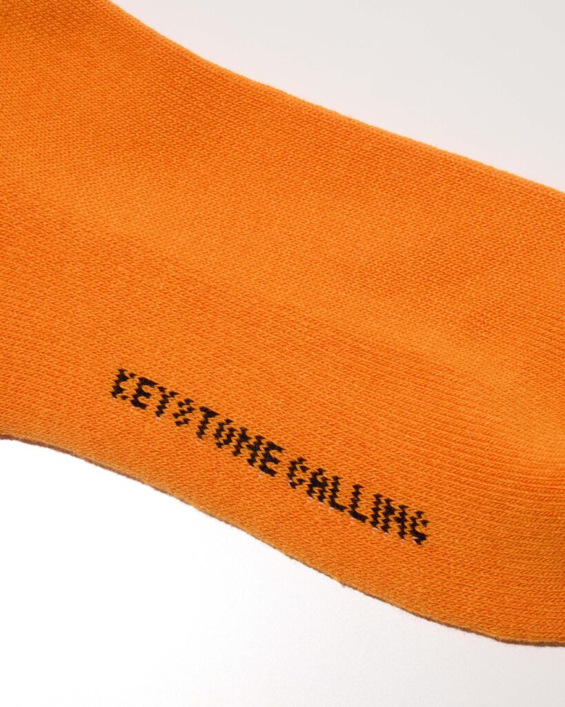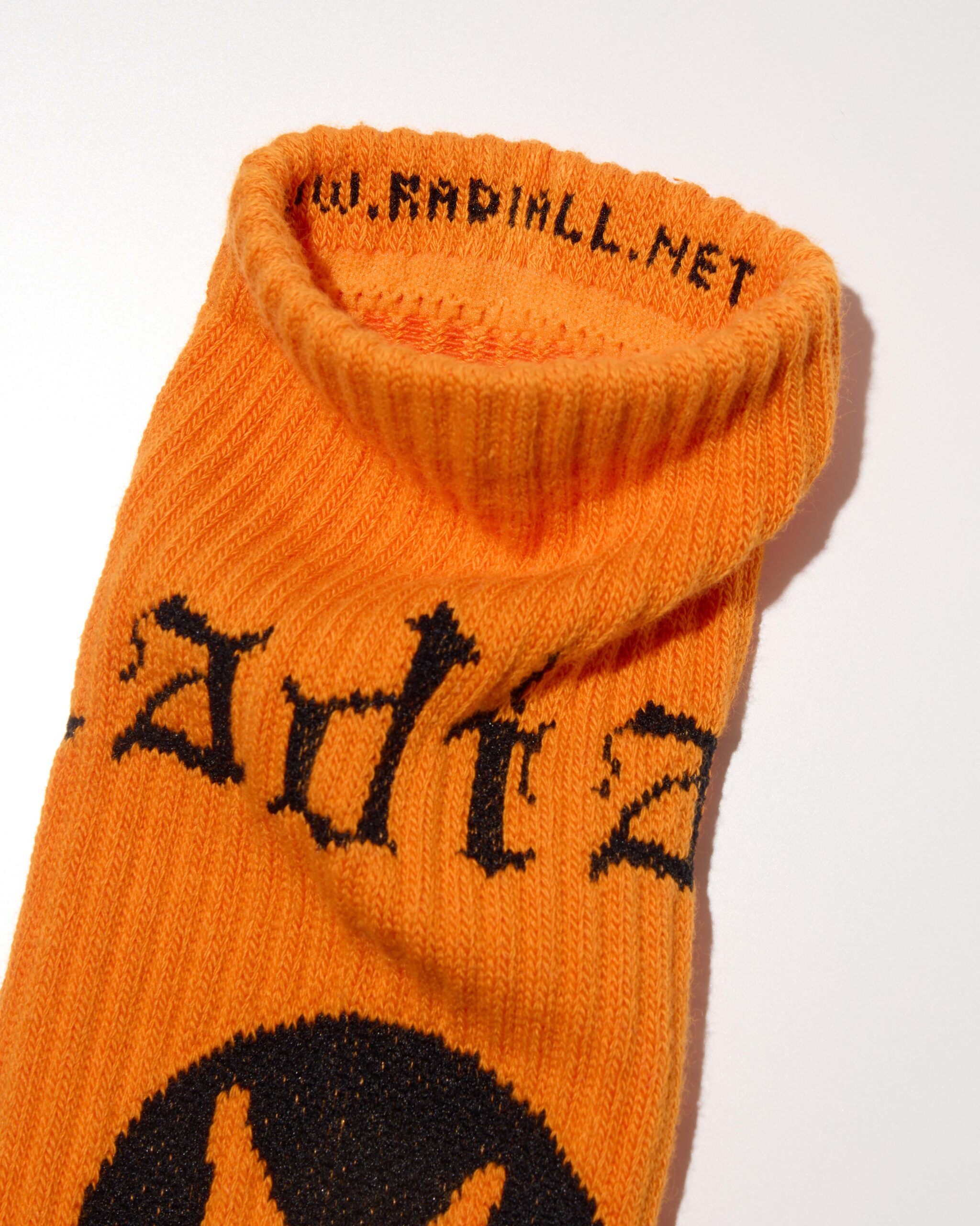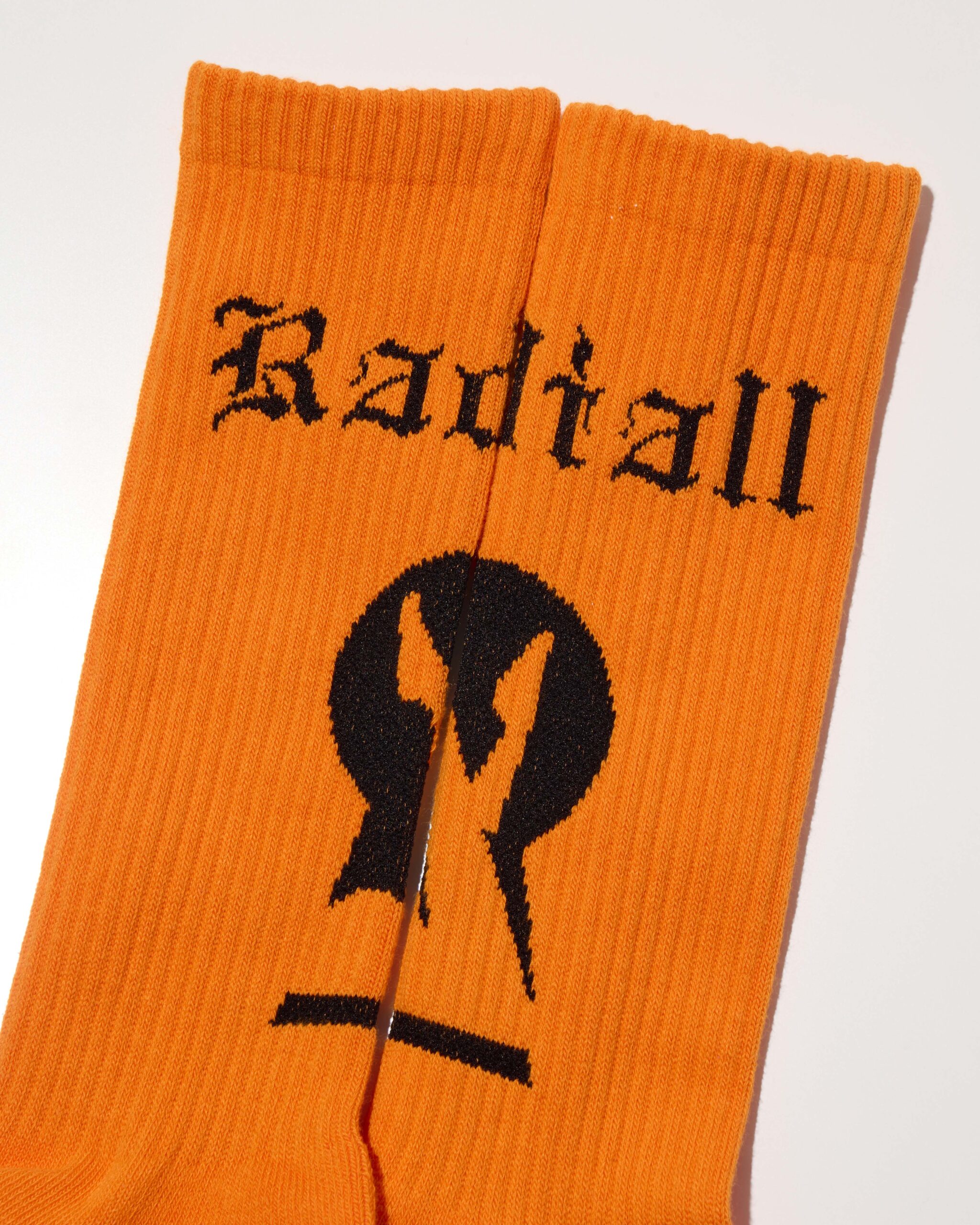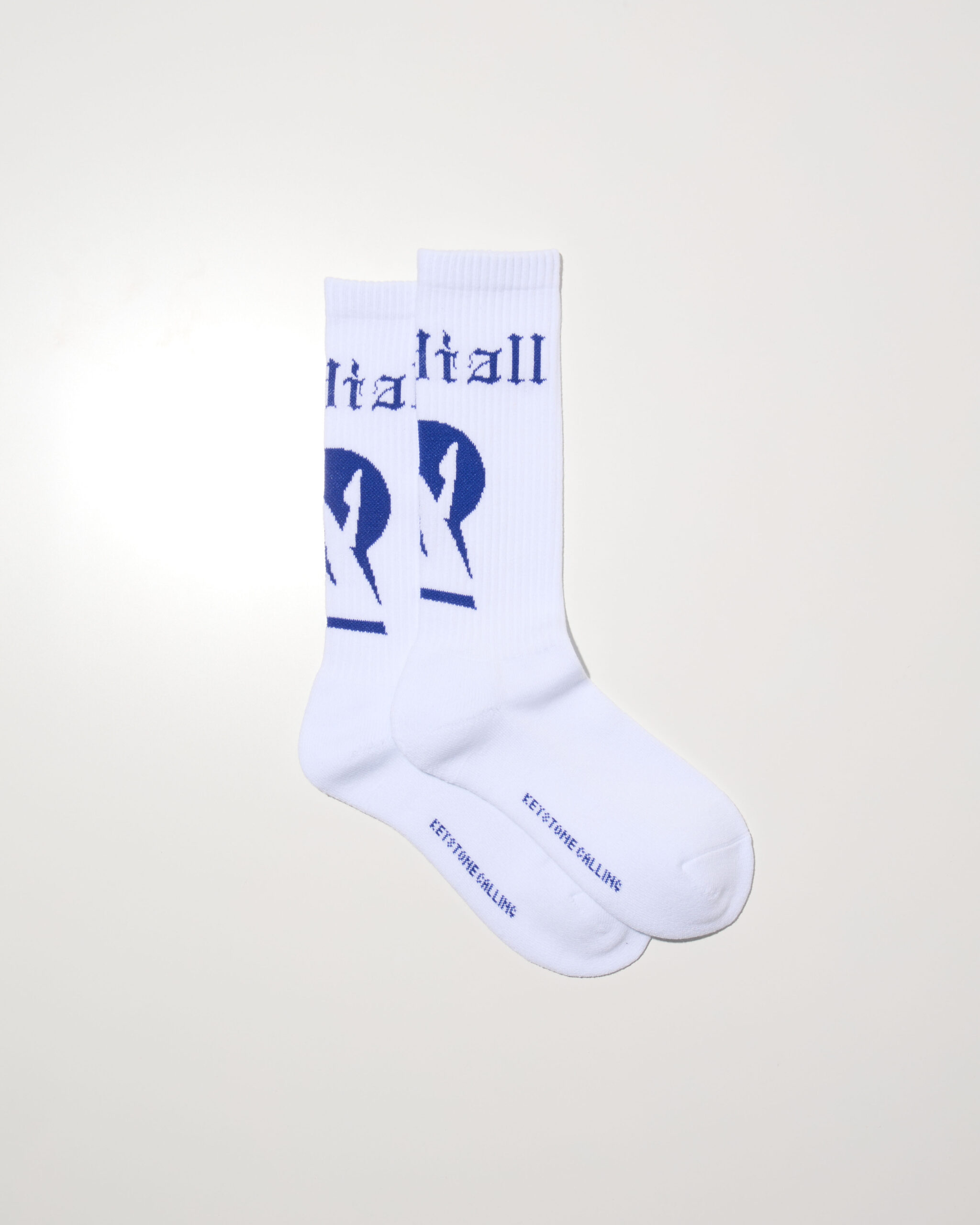 ジャガードでふくらはぎ側に「キーホール」、履き口裏に「WWW.RADIALL.NET」、足底に「KEYSTONE CALLING」が入る。