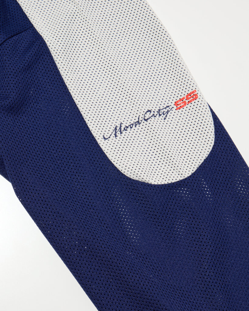 フロント、バックにそれぞれラバープリントでグラフィックが、両袖には刺繍でグラフィックが入る。