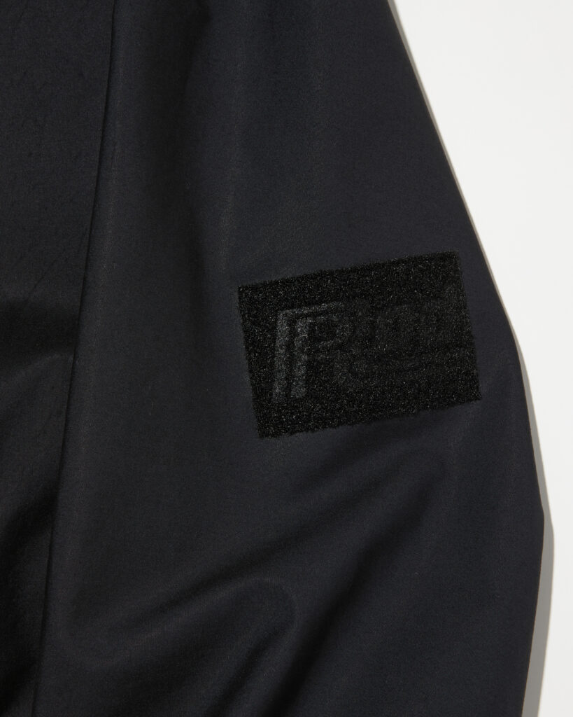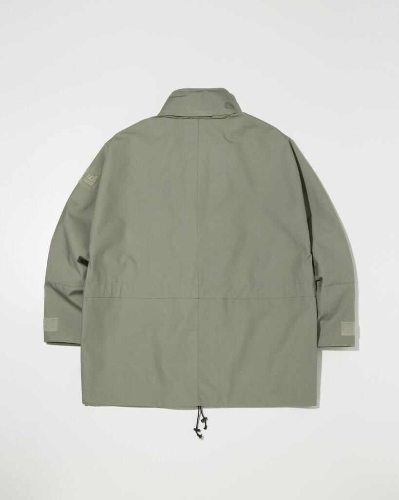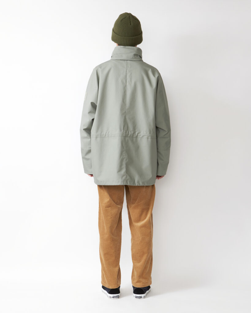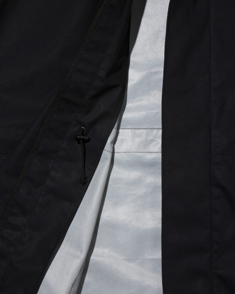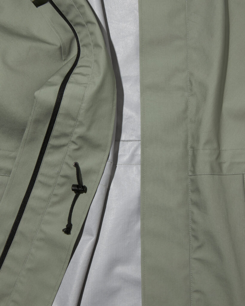 また、アームホールを無くすことで表面を流れ落ちる雨が内部に侵入しにくい縫製仕様を取り入れています。