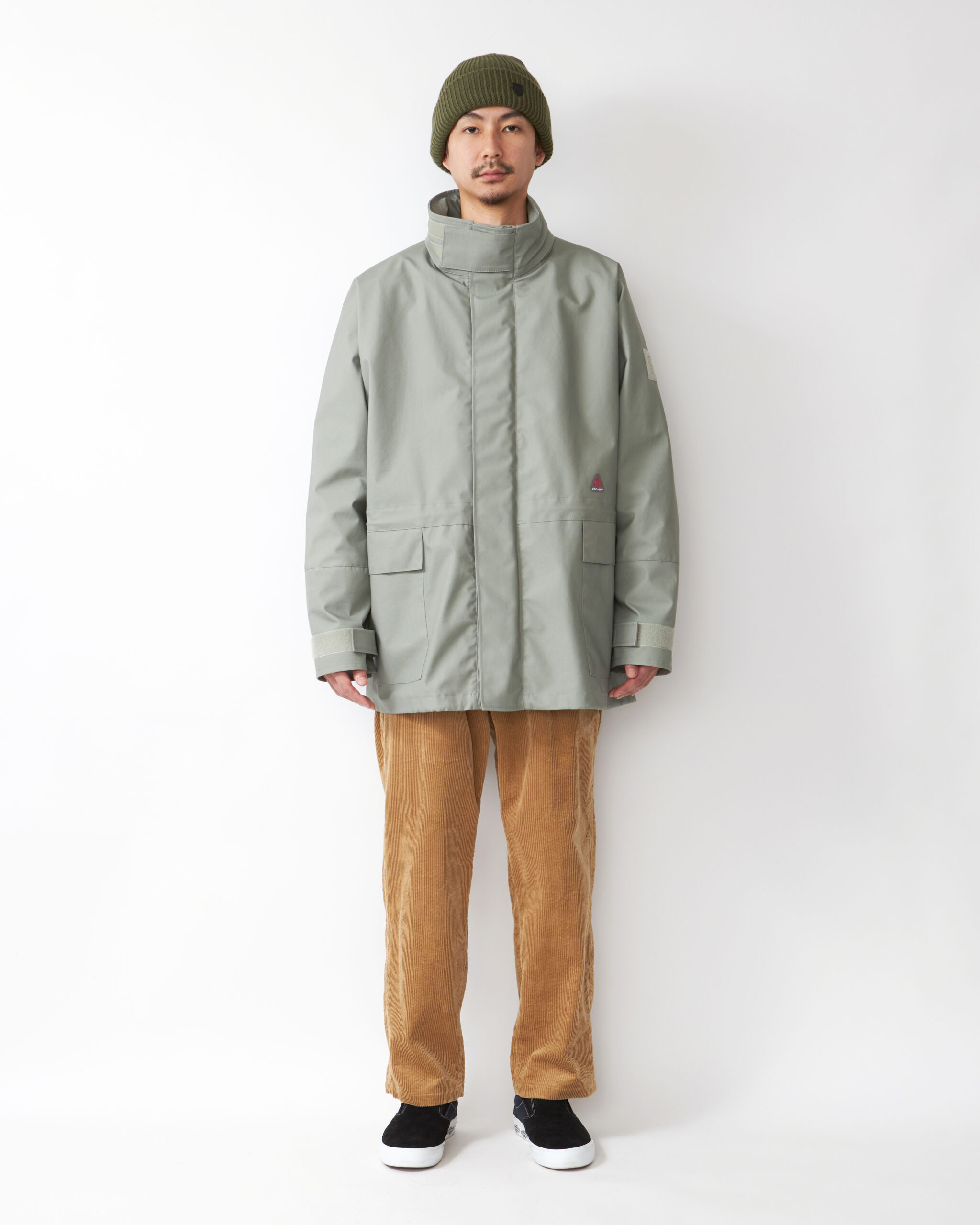 身巾、袖巾にゆとりを持たせ、タウンユースでの雨風に対応する3レイヤーを使用したスタンドカラーのハーフコートです。