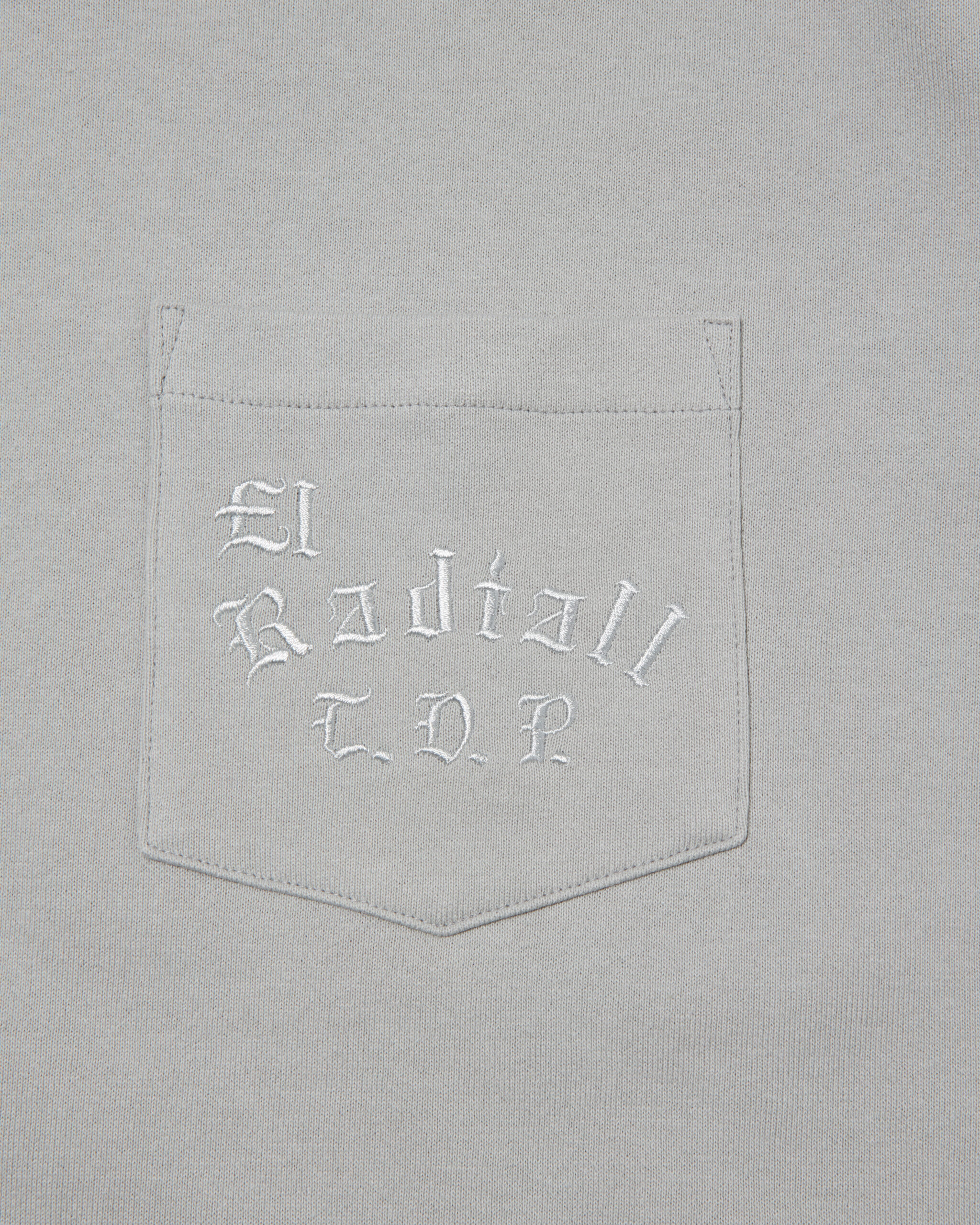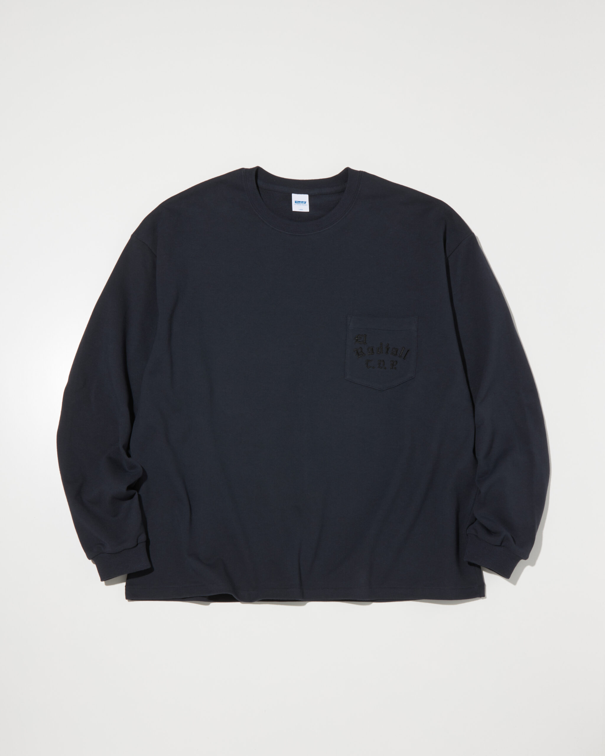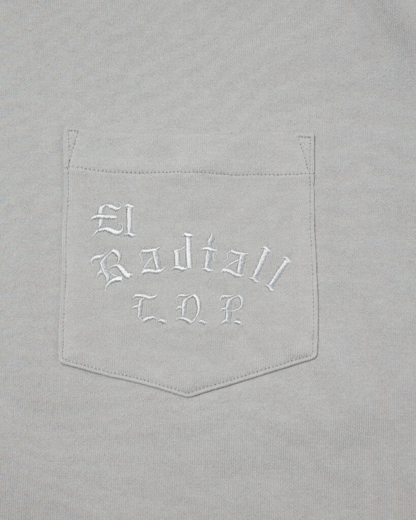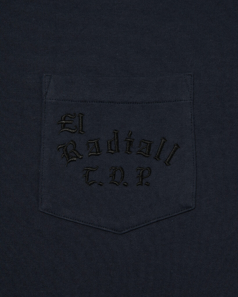 人気が高い手書きのブラックレターを胸ポケットに横振り刺繍で施しております。
